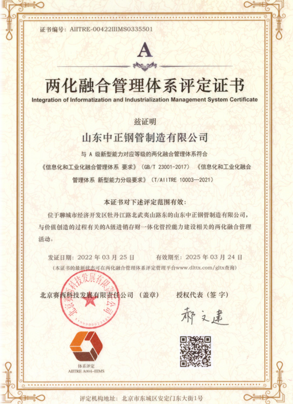 兩化融合管理體系評(píng)定證書(shū) |